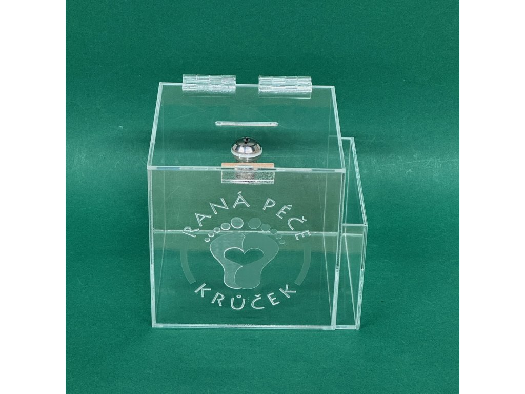 Plexi kasička, pokladnička s gravírováním o rozměru 150x150x150 mm s gravírem a kapsou na letáky a zámkem je vhodná pro Veřejné sbírky, které organizují neziskové organizace, nadace, charity, školy, obce, města, firmy, soukromé osoby, farnosti, vhodné také pro anketní lístky-vzkazy, vizitky či na spoření.