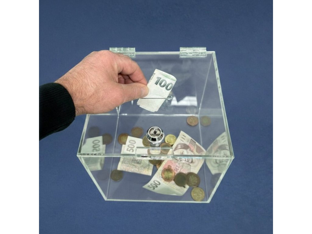 Plexi kasička, pokladnička o rozměru 150x150x150 mm + zámek, plexi čiré je vhodná pro Veřejné sbírky, které organizují neziskové organizace, nadace, charity, školy, obce, města, firmy, soukromé osoby, farnosti, vhodné také pro anketní lístky-vzkazy, vizitky či na spoření.