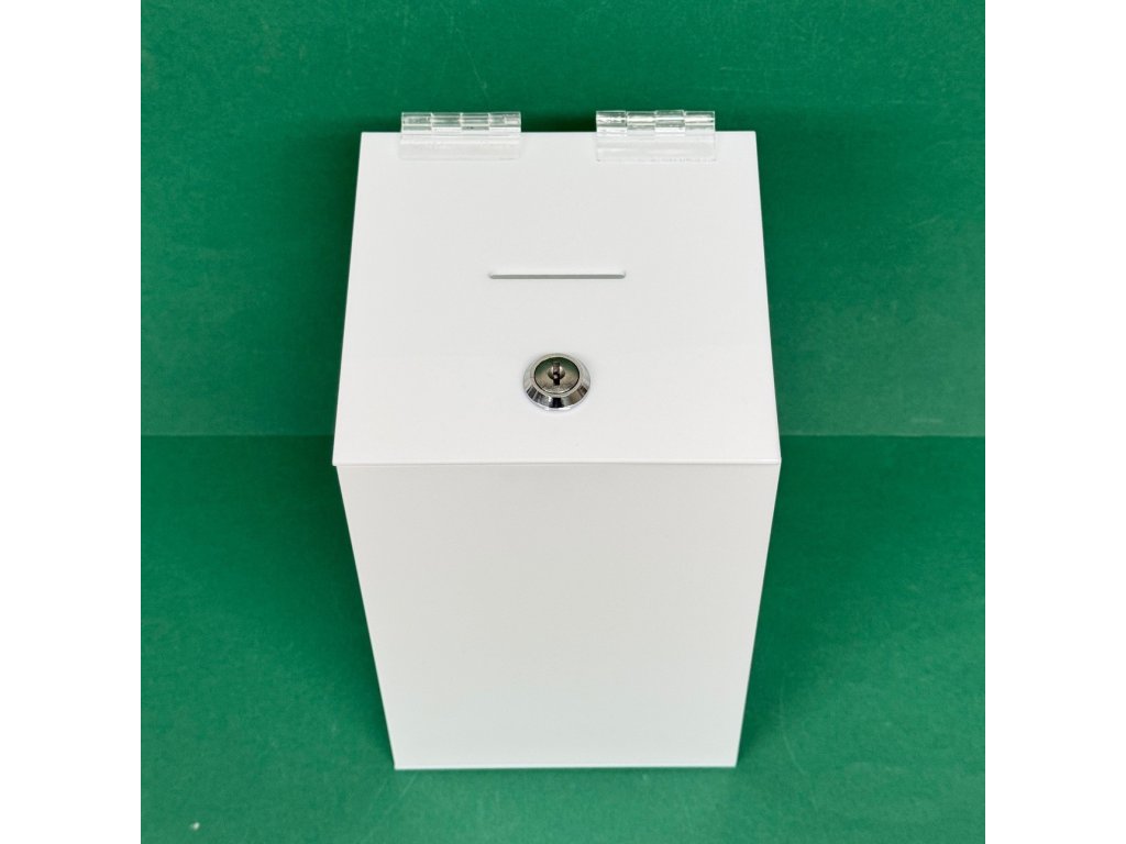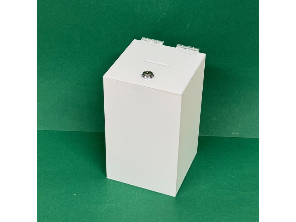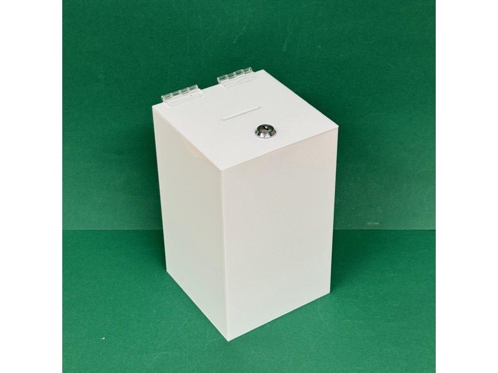 Plexi kasička, pokladnička na zámek o rozměru 150x150x250mm, plexi opál, neprůhledná je vhodná pro Veřejné sbírky, které organizují neziskové organizace, nadace, charity, školy, obce, města, firmy, soukromé osoby, farnosti, vhodné také pro anketní lístky-vzkazy, vizitky či na spoření.