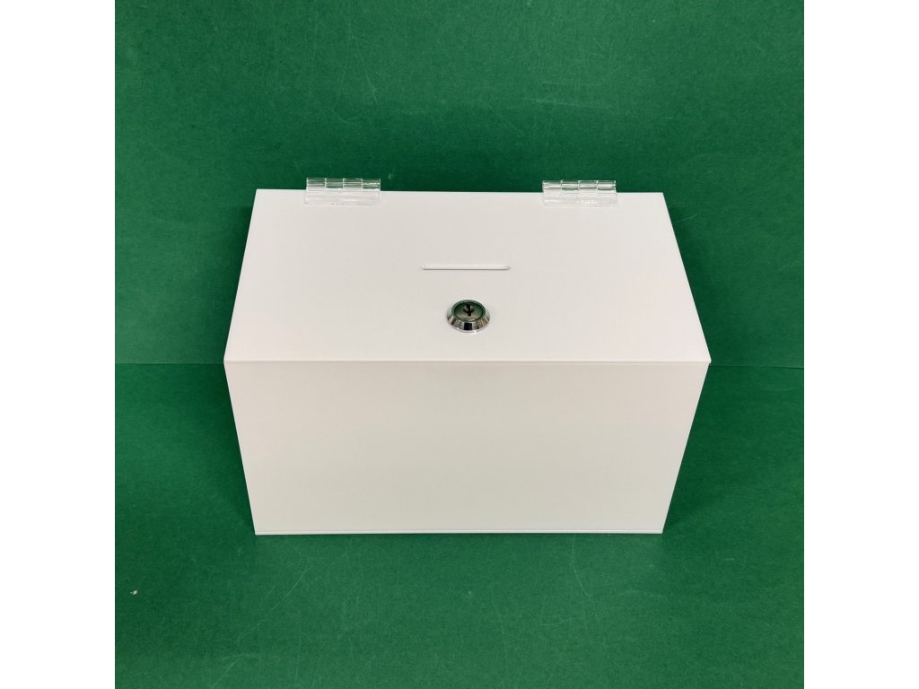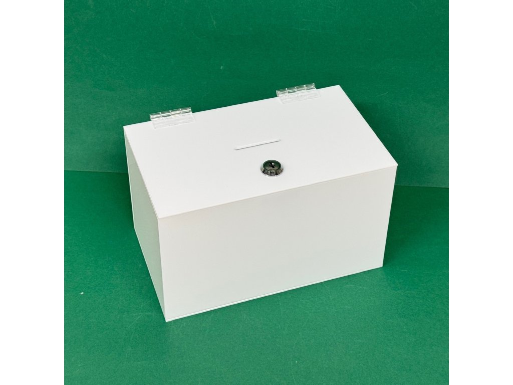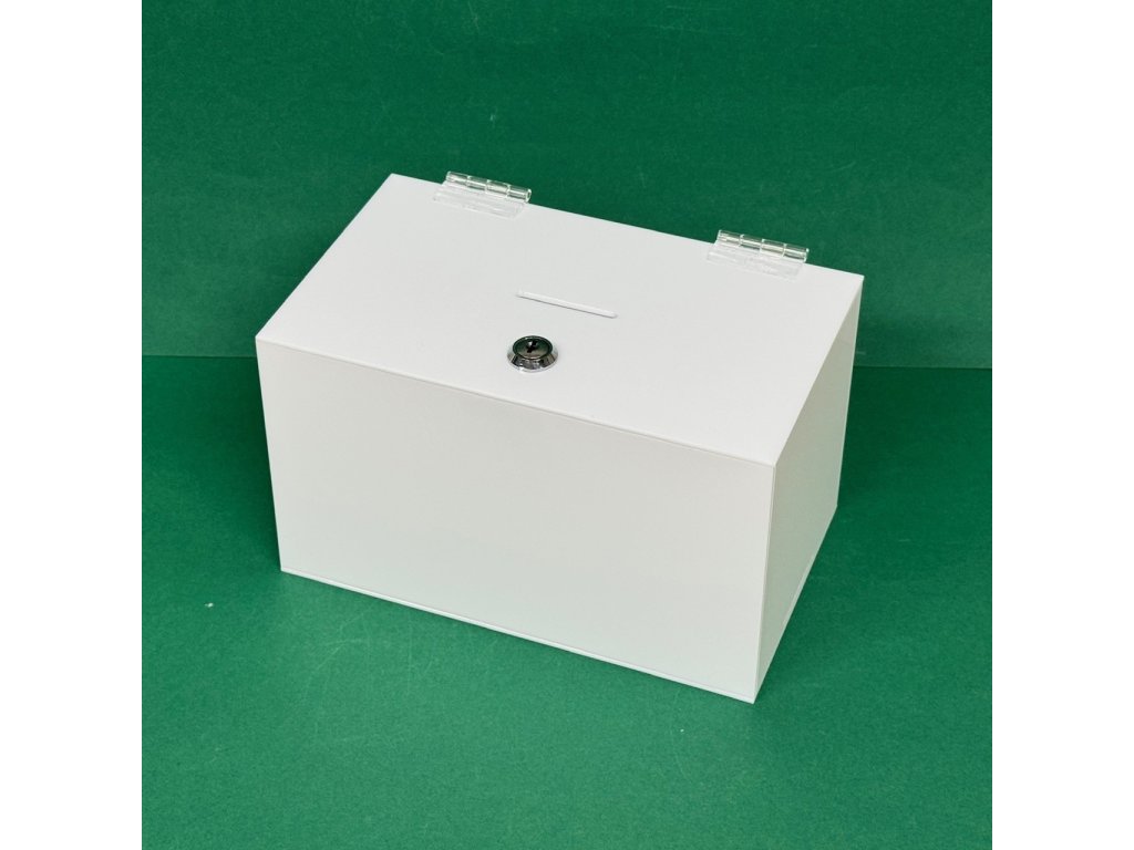 Plexi kasička, pokladnička se zámkem o rozměru 250x150x150mm, plexi opál - bílá - neprůhledná je vhodná pro Veřejné sbírky, které organizují neziskové organizace, nadace, charity, školy, obce, města, firmy, soukromé osoby, farnosti, vhodné také pro anketní lístky-vzkazy, vizitky či na spoření.