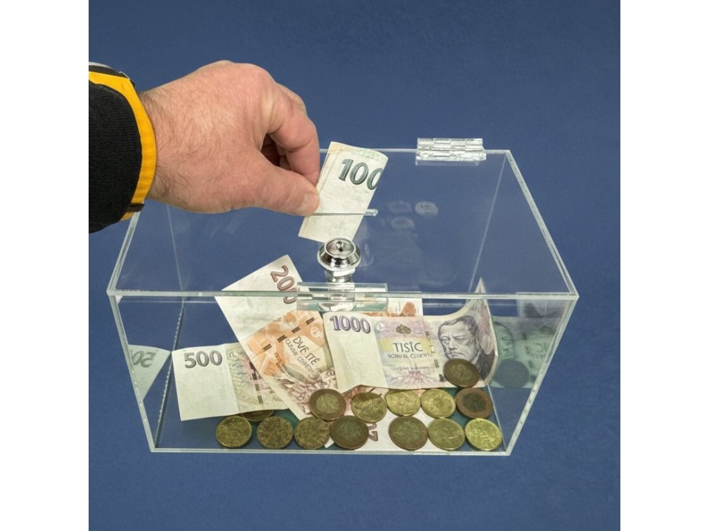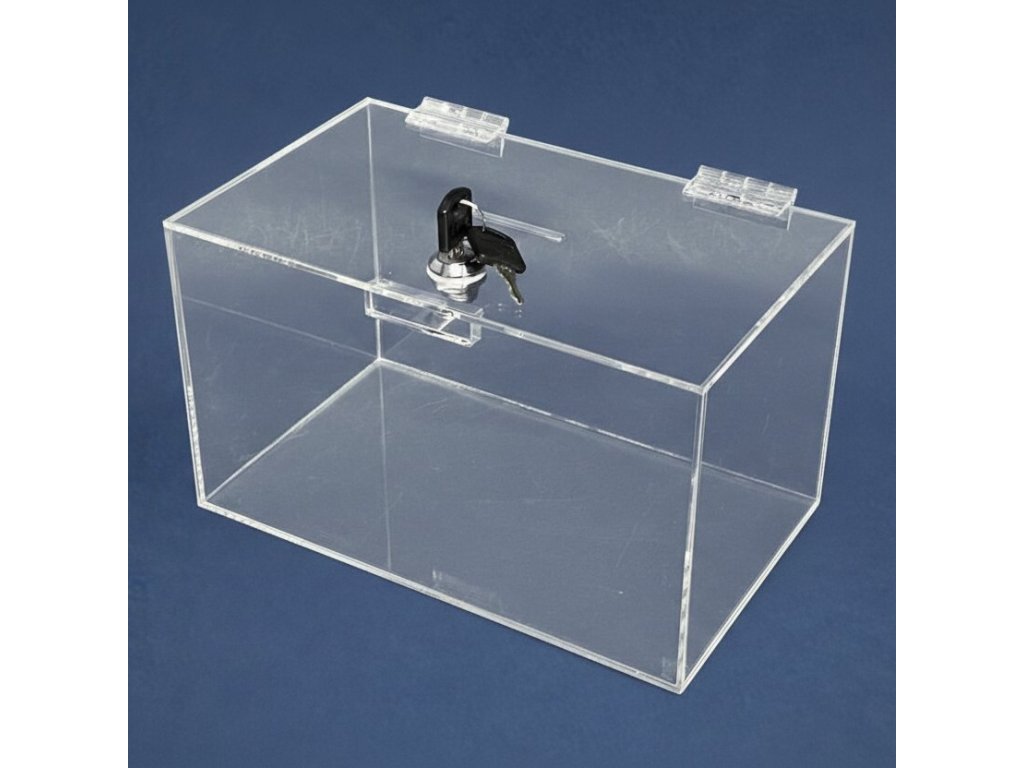 Plexi kasička, pokladnička se zámkem o rozměru 250x150x150 mm je vhodná pro Veřejné sbírky, které organizují neziskové organizace, nadace, charity, školy, obce, města, firmy, soukromé osoby, farnosti, vhodné také pro anketní lístky-vzkazy, vizitky či na spoření.