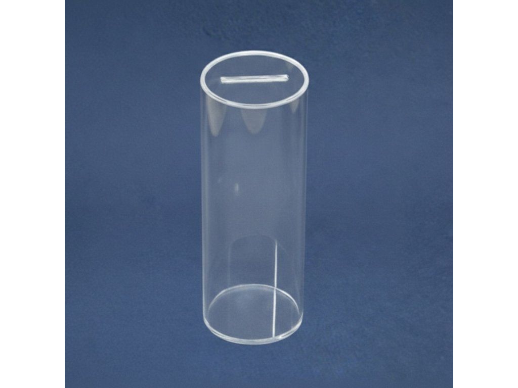 Plexi kasička, pokladnička ve tvaru válce o rozměru 80x220 mm je vhodná pro veřejné sbírky, které organizují neziskové organizace, nadace, charity, školy, obce, města, muzea, galerie, firmy, soukromé osoby, farnosti, vhodné také pro anketní lístky, losy, vzkazy, vizitky, spoření, dobrovolné vstupné.